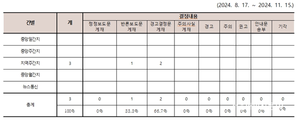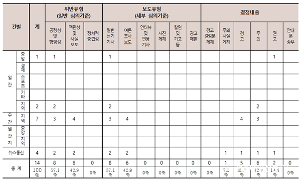 ÇÑÆí, 2024³â ÇϹݱâ À硤º¸±È¼±°Å ¼±½ÉÀ§´Â 11¿ù 15ÀÏ ¾à 3°³¿ù°£ÀÇ È°µ¿À» ¸¶¹«¸®Çß´Ù. ¼±½ÉÀ§´Â Áö³­´Þ 16ÀÏ ½Ç½ÃÇÑ 2024³â ÇϹݱâ À硤º¸±È¼±°Å¿Í °ü·ÃÇÑ ½Å¹®, ÀâÁö µîÀÇ Á¤±â°£Ç๰ ¹× ´º½ºÅë½Å¿¡ °ÔÀçµÈ ¼±°Å±â»çÀÇ °øÁ¤¼º ¿©ºÎ¸¦ ½ÉÀÇÇϱâ À§ÇØ Áö³­ 8¿ù 17ÀϺÎÅÍ ¾ð·ÐÁßÀçÀ§¿øÈ¸ »êÇÏ¿¡ ¼³Ä¡µÅ Ȱµ¿ÇØ ¿Ô´Ù. À̹ø ¼±½ÉÀ§´Â ÃÑ 6Â÷·ÊÀÇ È¸ÀǸ¦ °³ÃÖÇØ ÀÚü½ÉÀÇ 14°Ç, ½ÃÁ¤¿ä±¸½ÉÀÇ 3°Ç µî ¸ðµÎ 17°ÇÀ» ½ÉÀÇ¡¤ÀǰáÇÏ¿´´Ù.