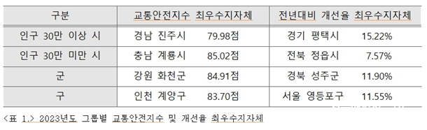 Àü³â´ëºñ ±³Åë¾ÈÀüÁö¼ö°¡ Çâ»óµÈ Áö¿ªÀº ÆòÅýÃ, Á¤À¾½Ã, ¼ºÁÖ±º, ¿µµîÆ÷±¸ÀÌ´Ù. ƯÈ÷, ÆòÅýô 2023³â ±³Åë¾ÈÀü¼öÁØÀÌ ¸ðµç ¿µ¿ª¿¡¼­ Å©°Ô °³¼±µÆ´Ù.