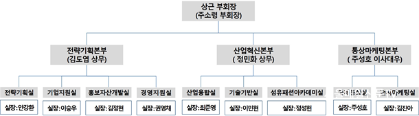 ÀÌ¿¡µû¶ó ±èµµ¿± »ó¹«ÀÌ»ç´Â Àü·«±âȹº»ºÎ(Àü·«±âȹ½Ç, ±â¾÷Áö¿ø½Ç, È«º¸Àڻ갳¹ß½Ç, °æ¿µÁö¿ø½Ç)¸¦, ÁÖ¼ºÈ£ ÀÌ»ç´ë¿ì´Â Åë»ó¸¶ÄÉÆÃº»ºÎ(±¹Á¦Åë»ó½Ç, Àü½Ã¸¶ÄÉÆÃ½Ç)¸¦ ÃѰýÇÏ°Ô µÈ´Ù.