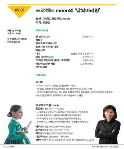 ¡®ÇÁ·ÎÁ§Æ® moon¡¯Àº ±¹¾Ç±â¿Í ¼­¾ç¾Ç±â°¡ ÇÔ²² ¿¬ÁÖÇÏ´Â À½¾ÇÀ» ÅëÇØ¼­ ±¹¾ÇÀÇ Á¤°¥ÇÔÀ» ´õ¿í ºÎ°¢½ÃŰ°í ¼­¾ç¾Ç±â·Î Ç¥ÇöÇÏ´Â ±¹¾ÇÀÇ »õ·Î¿î ¸ÚÀ» º¸¿©ÁÖ±â À§Çؼ­ Ȱµ¿Çϰí ÀÖ´Â ÀÛ°î°¡ ¹®½Å¿ø Áß½ÉÀÇ ÇÁ·ÎÁ§Æ® ±×·ìÀÌ´Ù. ƯÈ÷ ¾ç¹æ¾ð¹êµå¿¡¼­ Ȱµ¿Çϰí ÀÖ´Â ³ªÀα¹(ÿ·Î)°ú ¾È»ê½Ã¸³±¹¾Ç´ÜÀÇ ÇØ±Ý¼ö¼® ¿¬ÁÖÀÚÀÎ Á¶ÁÖÈñ µî ½Ç·ÂÆÄ ¿¬ÁÖÀÚµé·Î ±¸¼ºµÇ¾î ÀÖ´Ù.